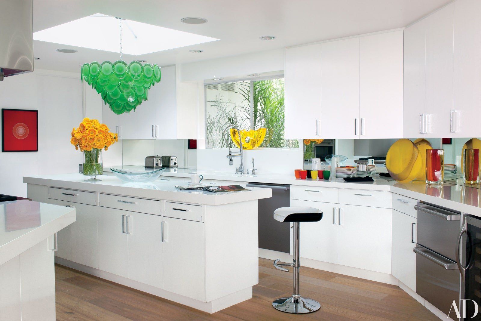 Straight out of the seventies, Elton John’s island, and indeed the rest of his kitchen, is focused on crisp white symmetry and occasional bursts of colour. Opting for a white gloss finish in place of wood, stone or stainless steel this white lightens up the ground floor kitchen and creates a sense of space.